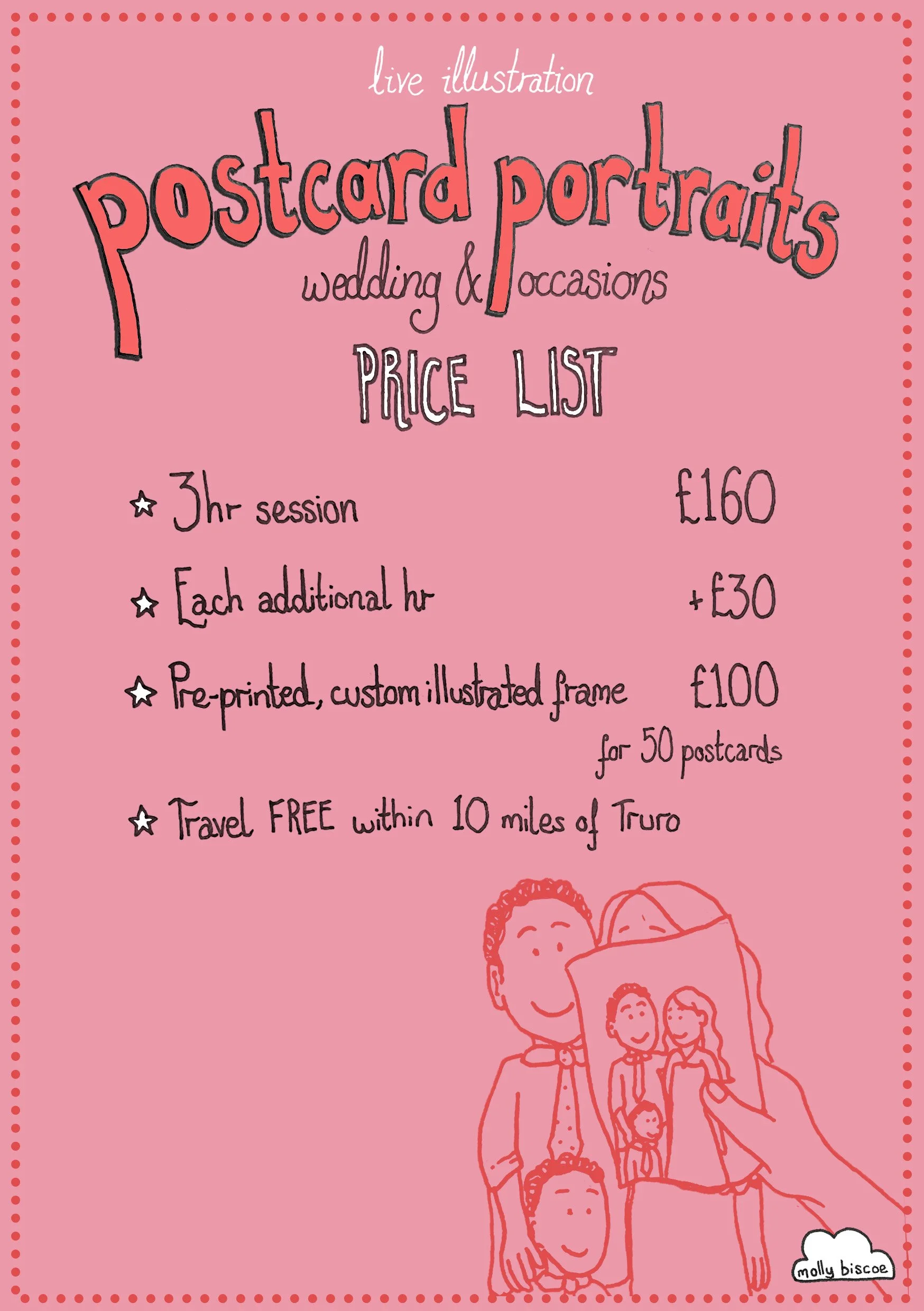 My “postcard portraits” pop up at local markets, festivals and events. They take between 5-10 minutes (depending on how much background detail you’d like!) and can be of just you or a group. I will draw pretty much anything (within reason…!!) and I usually include a bit of text of your choice at the top.